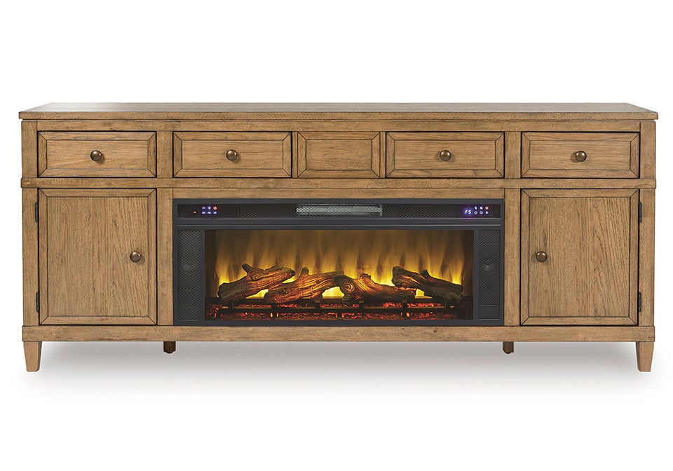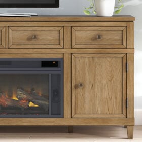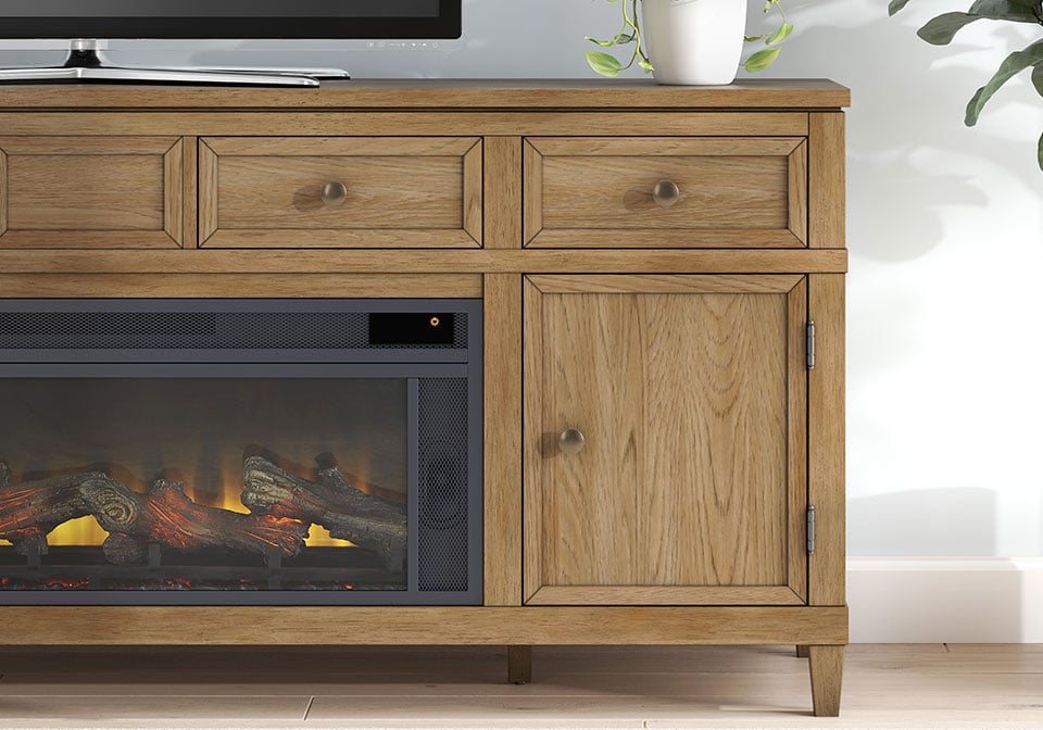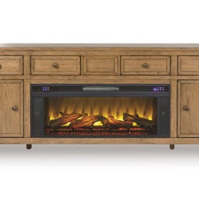 Taking a timeless approach to casual beauty, this TV stand with electric fireplace brings easygoing elegance to the everyday. With its light brown wood tone, it seamlessly slips into your room’s aesthetic. Two spacious cabinets (each with an adjustable shelf) and four drawers offer plenty of storage for media and electronics. Enhancing the experience, the fireplace insert brings a touch of warmth and beautiful ambiance to your living room. With the touch of a button, adjust the temperature and the flame brightness, and connect your device to the built-in wireless speakers. The flame effect includes a realistic-looking log set with glowing embers, along with an ambient down light.