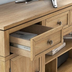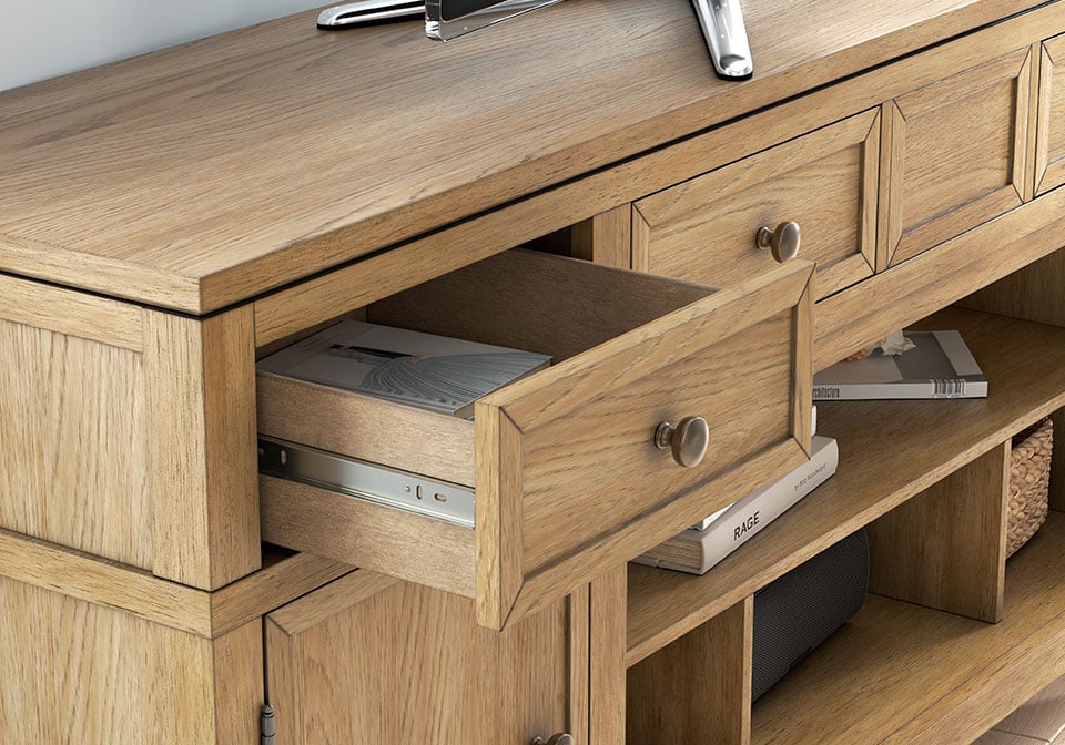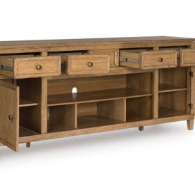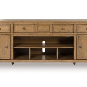 Taking a timeless approach to casual beauty, this TV stand brings easygoing elegance to the everyday. The light brown wood-tone finish seamlessly slips into your room’s aesthetic. Two spacious cabinets (each with an adjustable shelf), four drawers and an open center shelf offer plenty of storage for media and electronics. Enhancing the experience: the optional fireplace insert (sold separately) brings a touch of warmth and beautiful ambiance to your living room.