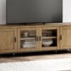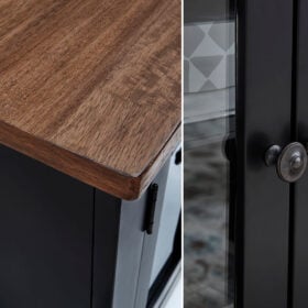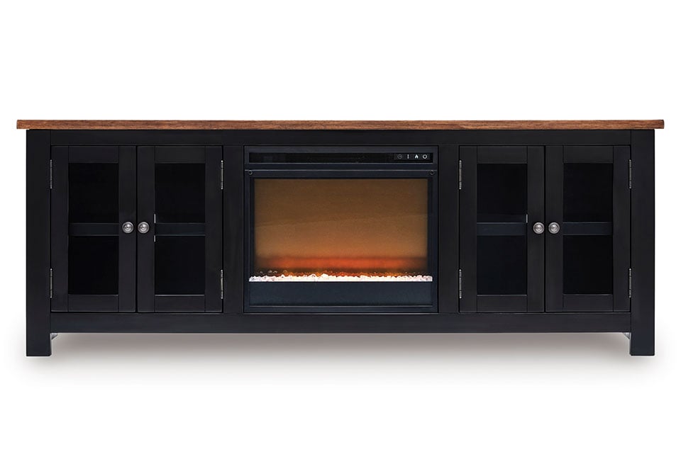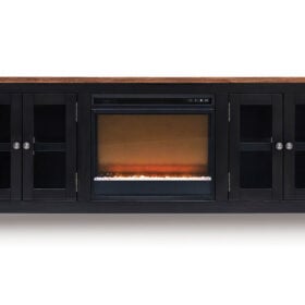 Raise the bar on modern farmhouse style with this TV stand with electric fireplace. Its sturdy silhouette and casual good looks are accentuated with a two-tone finish, which pairs a warm satin black base with a contrasting butcher block veneer top. Glass door cabinets with adjustable shelves offer plenty of storage for media and electronics. Adding that much more show-stopping style, the electric fireplace insert operates with or without heat and includes a six-level temperature setting, a remote control and an overheating control for added safety. It comes with faux glass crystals and natural stones, so you can customize the look of the flame bed.