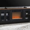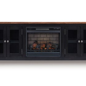 Raise the bar on modern farmhouse style with this TV stand with electric fireplace. Its sturdy silhouette and casual good looks are accentuated with a two-tone finish, which pairs a warm satin black base with a contrasting butcher block veneer top. Glass door cabinets with adjustable shelves offer plenty of storage for media and electronics. What really turns up the heat: an electric infrared fireplace insert with faux firebrick surround that operates with or without infrared heat. With the touch of a button, adjust the temperature and the flame brightness, and set the timer for long-lasting enjoyment.