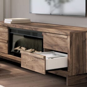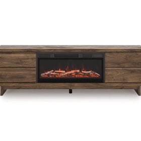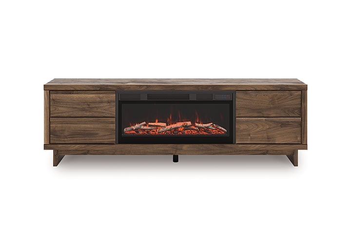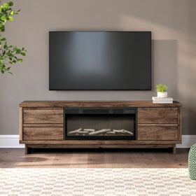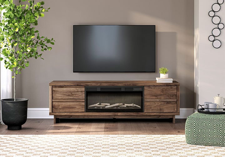 Nostalgic style, retooled for today’s trends. This TV stand with electric fireplace puts an elevated twist on mod aesthetics. Its warm brown tones reflect the mid-century vibes you love, while the angular base incorporates contemporary motifs. Integrated drawer handles round out the look in sleek style. For added ambiance, the electric fireplace brings a cozy-cool vibe to your living room. With the touch of a button, activate the LED-lit flame and adjust the temperature or the flame brightness. The flame effect includes multiple color options and a realistic-looking faux birch log set.