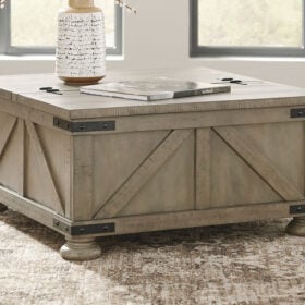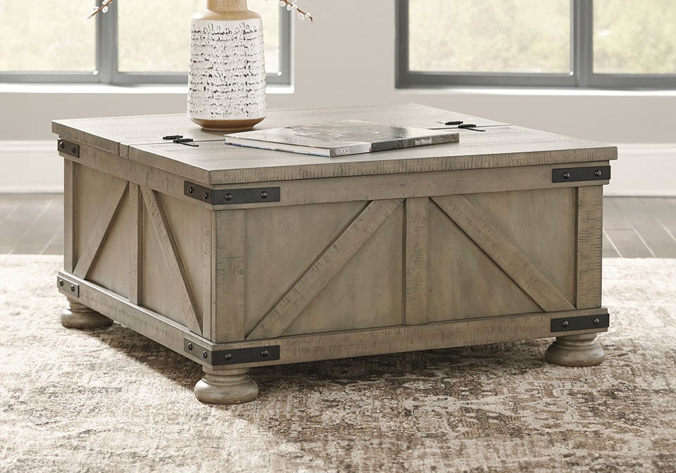 Aldwin Gray Occasional Series by Ashley. The epitome of rustic farmhouse design. Made with Pine solids and veneers with a distressed weathered gray finish. Cross-buck details. Dual lids on cocktail designed for easy access to the large capacity storage area.