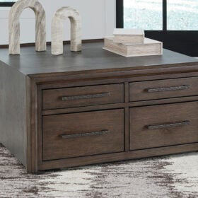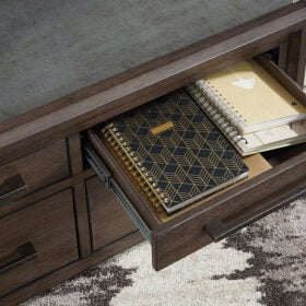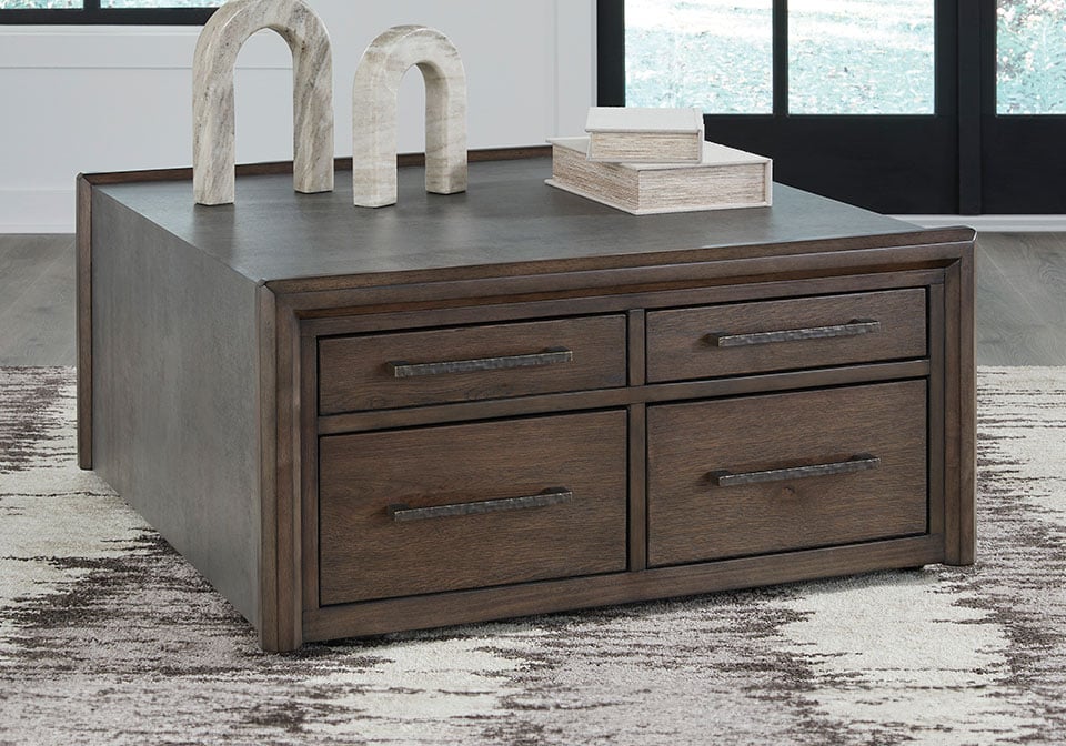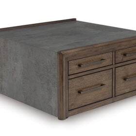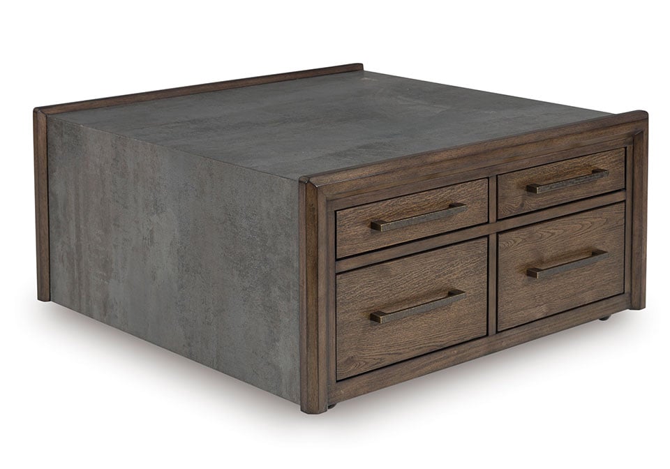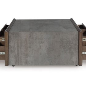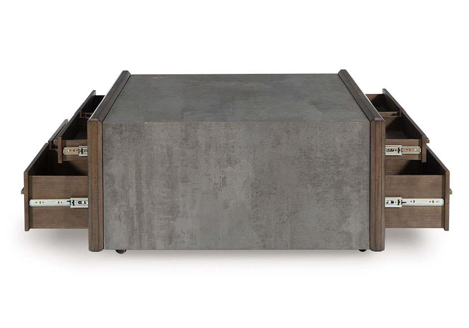 Master the art of mixed-material design with this coffee table. It sports an urban vibe, with faux cement lending an industrial edge to the contrasting dark brown finish. For a functional touch, spacious drawers store essentials for living room lounging in style. Detailed mouldings on the side add even more cool character.
