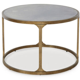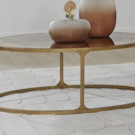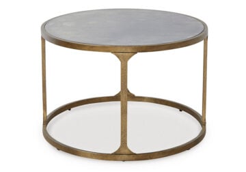 This coffee table blends a traditional feel with contemporary design cues. Antiqued gold texturing on the frame has the look of timeworn, hand-forged metal. A tempered glass top with a faux marble finish provides a refined contrast. Chic when hosting decor or holding entertainment essentials, this table rounds out your living room with transitional flair.