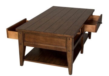 Made with Poplar Solids w/ Oak Veneers with a Rustic Brown Oak finish. Cocktail Table with Casters. Appealing Planked Tops & Tapered Legs. Veneered Shelves. Rectangular 48 Inch Cocktail Table. Push Through Drawers on Cocktail Table. Multi-Step Hand Applied Finish. Wood-on-Wood Drawer Glides. Antique Brass Hardware.