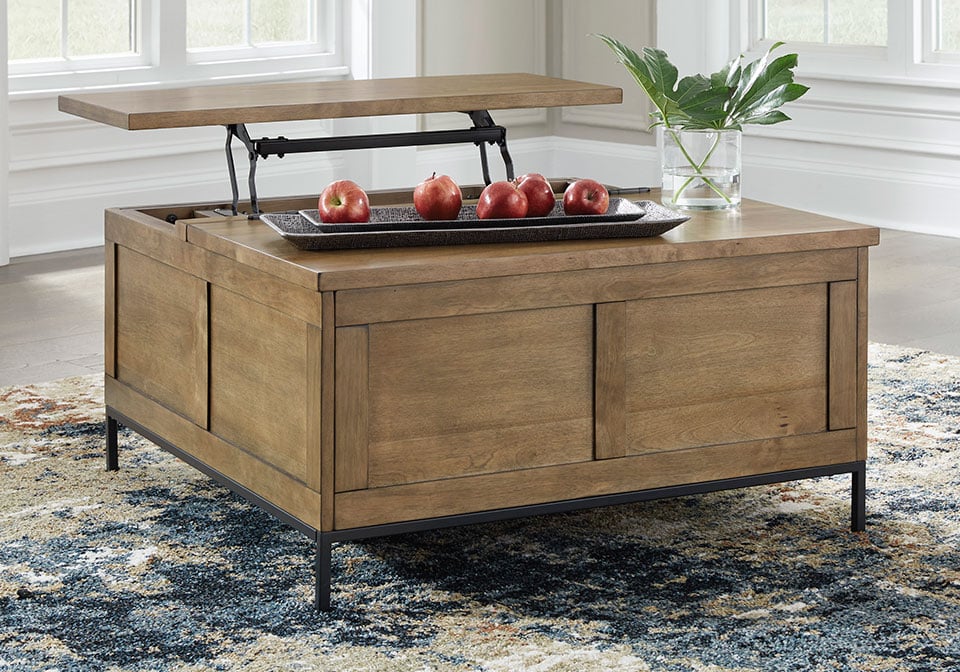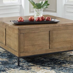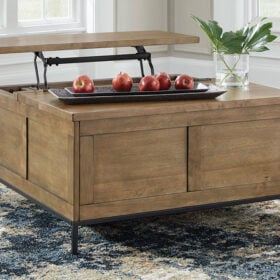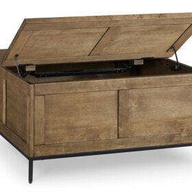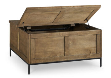 Made for the everyday, this coffee table is a sleek complement to your casual contemporary living room. You’ll love the refined-yet-relaxed vibe of its contrasting medium brown finish and matte black legs. Store throw blankets and more under the spacious hinged lid. And for added function, the other half of the tabletop conveniently lifts to become an instant work from home desk or dining space.