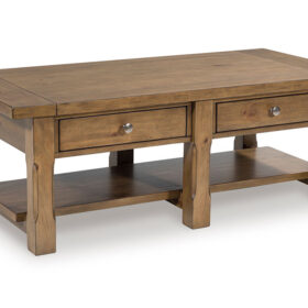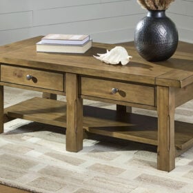 The timeless styling of this coffee table is well-suited to casual and farmhouse-inspired spaces. Its versatile burnished brown finish seamlessly pairs with neutrals and muted tones alike. With drawers for sofa-side storage and a bottom shelf for displaying decor, this chic table beautifully suits everyday living.