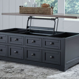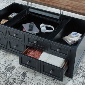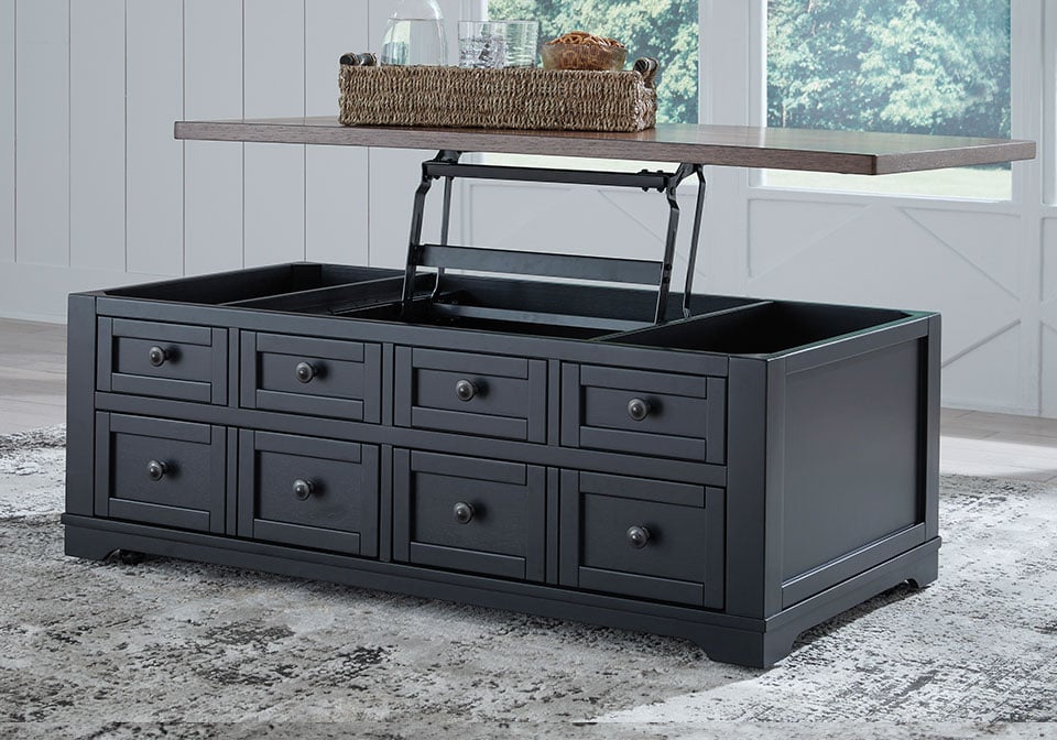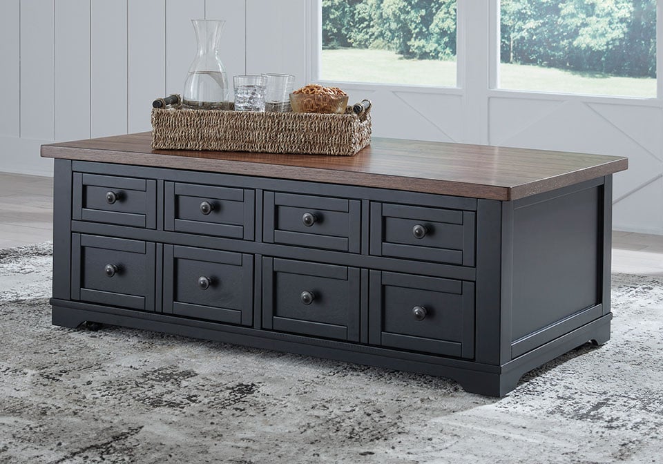 Raise the bar on modern farmhouse style with this lift-top coffee table. Its sturdy silhouette and casual good looks are accentuated with a two-tone finish, which pairs a warm satin black base with a contrasting butcher block veneer top. Combining form and function, its lift top extends for a casual dinner or extra work space in front of your sofa. Two spacious lower drawers and handy storage bins under the top make this piece awfully useful, too. Whether your style is vintage, country or eclectic, this table adds a hearty element.