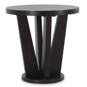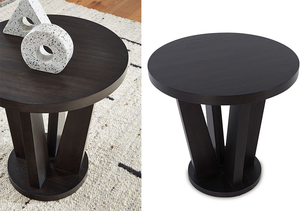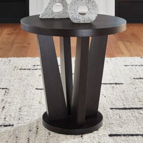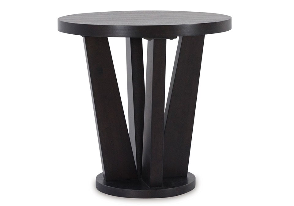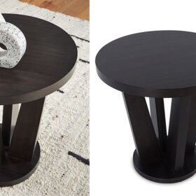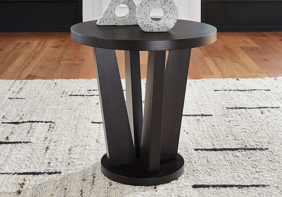 For the ultimate in casual contemporary styling, accent your sofa or loveseat with this chic end table. Designed with a round top and trapezoid-shaped legs, its geometric elements create a bold, eye-catching look.