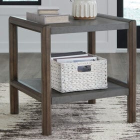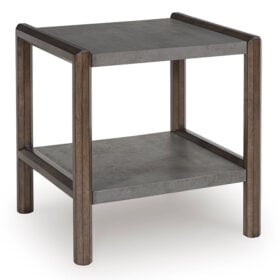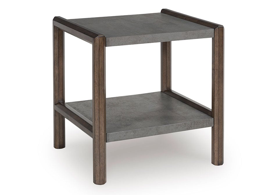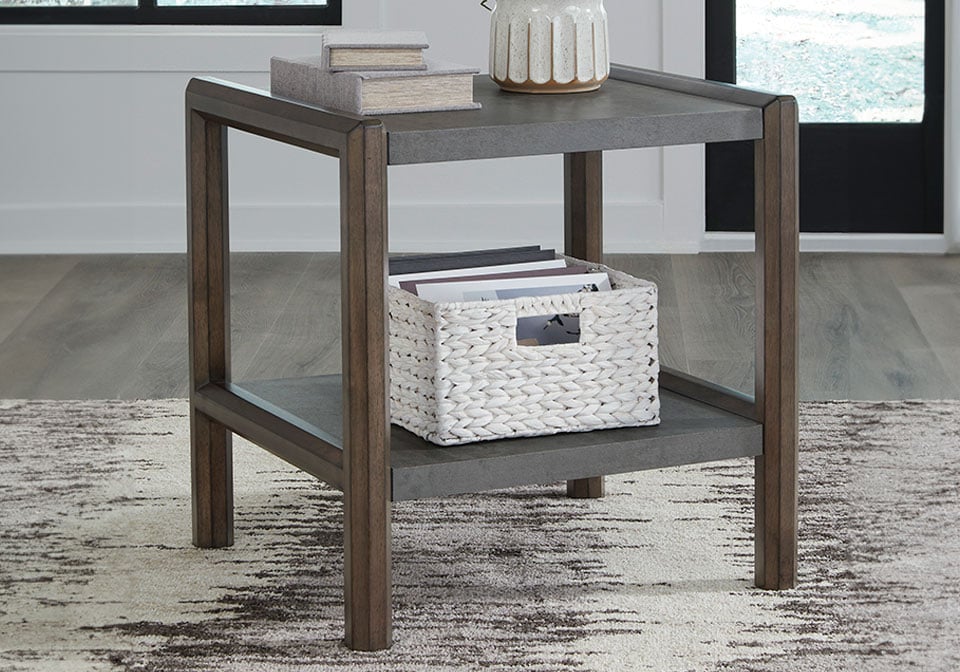 Master the art of mixed-material design with this end table. Sporting an urban vibe, its faux cement lends an industrial edge to the contrasting dark brown finish. For a functional touch, a lower shelf showcases your decor in style. Detailed mouldings on the sides add that much more cool character.