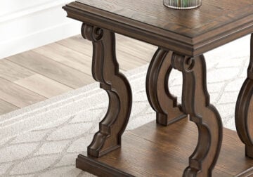Lavish, luxurious living is within reach when you add this end table to your living room. Recalling a classic sense of refinement, its elegant scrolled legs make a beautifully bold statement. Ornate details on the apron add an air of opulence to the regal dark brown finish. The look is timeless. The feel? Right at home.