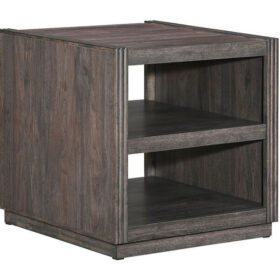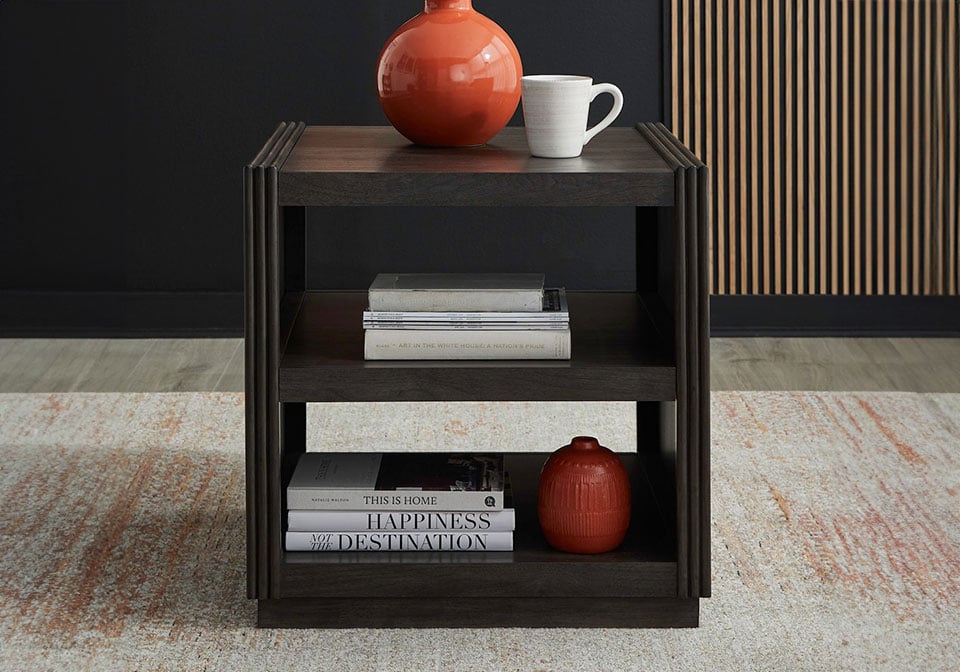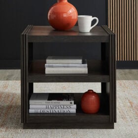 Add modern sophistication to your space with the Modern Edge End Table. Crafted of Rubberwood solids with Melamine in a deep Caffe finish, this table blends durability with striking style. Raised end panels and reeded pilasters offer architectural detail, flowing into an open fixed center shelf and bottom shelf—perfect for both storage and display. The plinth-style base completes the clean, contemporary look, making this end table a perfect companion piece for today’s modern living spaces.