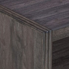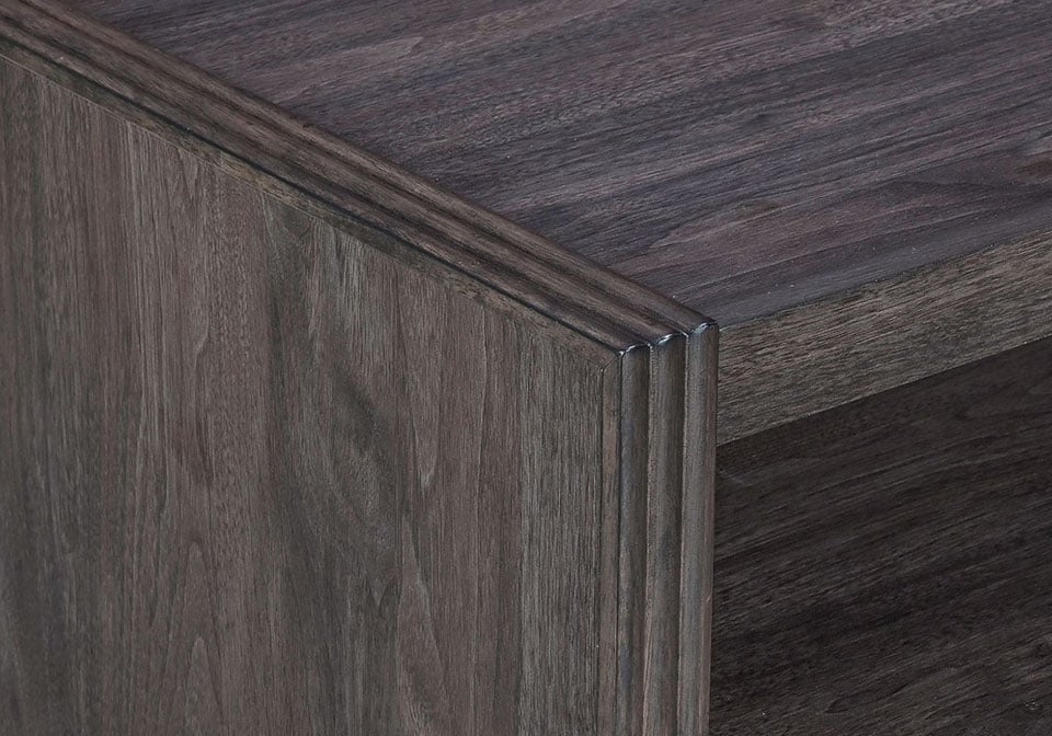 Wood: Rubberwood Solids w/ Melamine. Finish: Caffe. Raised Reeded End Panel Frame. Plinth Style Base. Fixed Wood Center Shelf. Bottom Shelf for Storage & Display