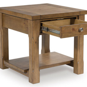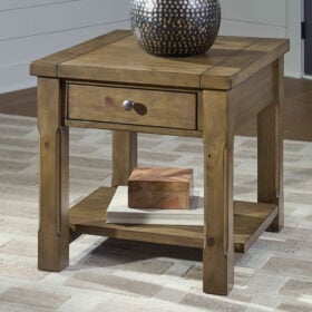 The timeless styling of this end table is well-suited to casual and farmhouse-inspired spaces. Its versatile burnished brown finish seamlessly pairs with neutrals and muted tones alike. With drawers for sofa-side storage and a bottom shelf for displaying decor, this chic table beautifully suits everyday living.