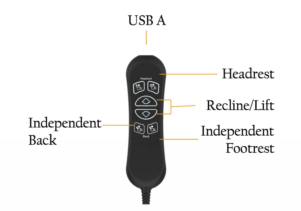 Dual Motor Lift Mech. Power Headrest System. Steel Seat Box. Chaise Pad Design Fully Supports Legs Eliminating Pressure Points. Footrest Extension. All Close and Lift Button. Hand Control with USB A port. Aesthetic Design. Hidden Cupholders.