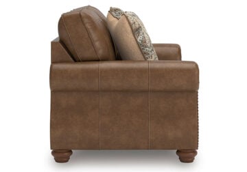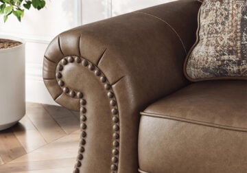 Everyone can have the best seat in the house with this Series. Its nailhead trim puts the finishing touches on the traditional roll arms you love. Comfy, durable cushions—wrapped in a rustic yet sophisticated faux leather—keep you feeling relaxed. Chenille Accents in a distressed motif pattern add another layer of comfort. Turned legs show that style and quality flow from top to bottom.