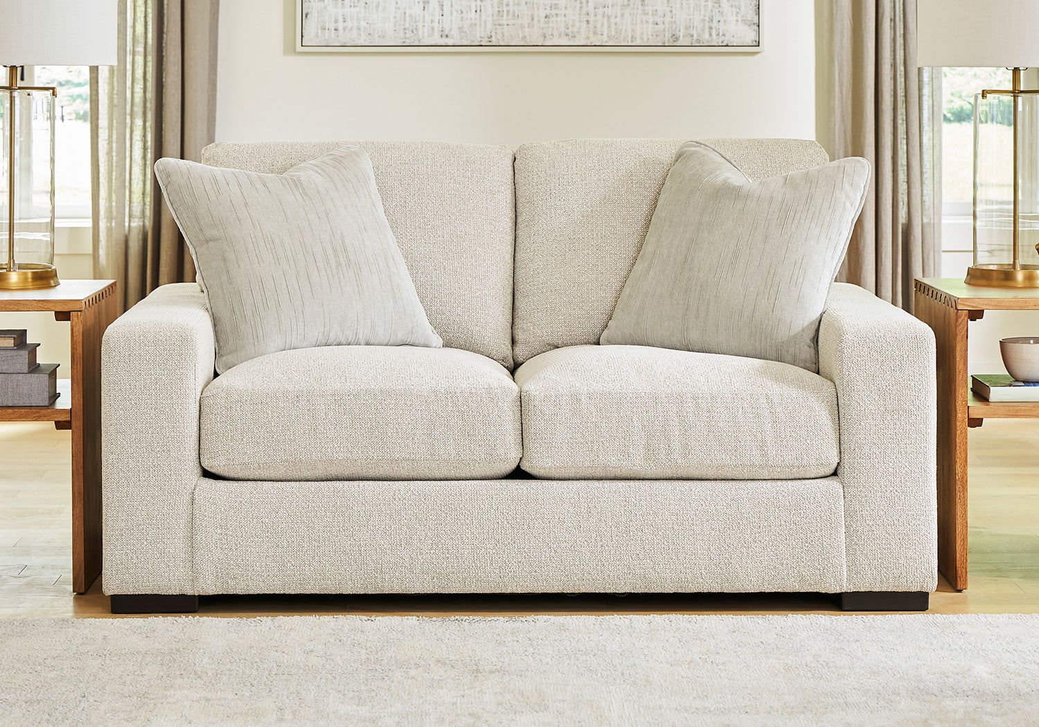A triumph in transitional design, this Series invites you to indulge in complete comfort. The contemporary yet classically styled piece is covered in oh-so-soft boucle upholstery for a sense of stately sophistication. Decorative velvet pillows in muted hues complete the vibe.