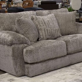 Soft textured chenille upholstery. Deep, plush seating for superior comfort. Pillow-top arms and overstuffed cushions. Stylish tonal accents Timeless neutral design suits any déco. Steel Tech Framing.