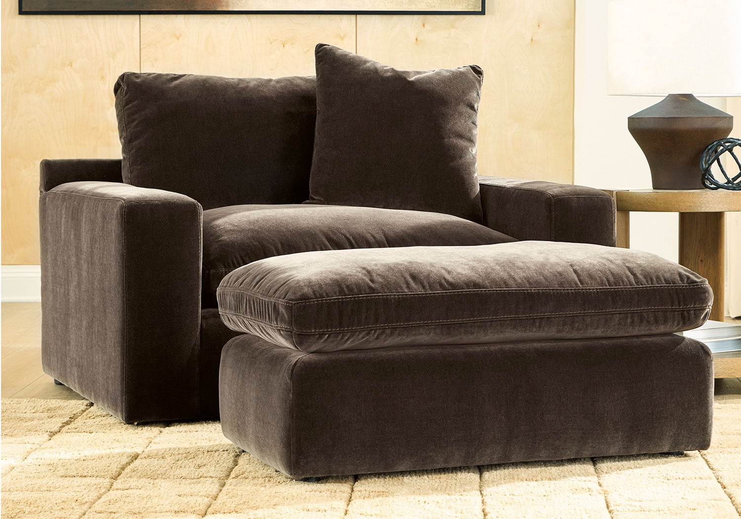 Reinforced frame provides added stability. Firmly cushioned. Multilayer cushion features memory foam and high-quality foam surrounded by a soft feather-fiber blend for elevated comfortt. Polyester velvet upholstery. Non-skid legs.