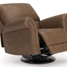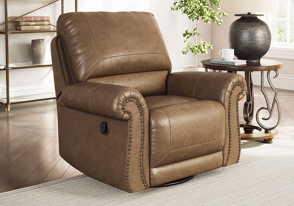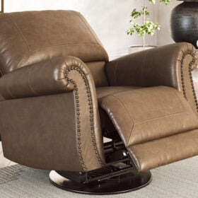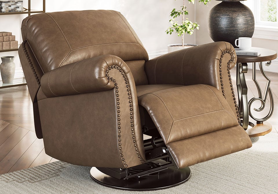 Everyone can have the best seat in the house with this swivel glider recliner. Its nailhead trim puts the finishing touches on the traditional roll arms you love. The recliner’s comfy, durable cushions—wrapped in a rustic yet sophisticated faux leather—keep you feeling relaxed, while its turned legs show that style and quality flow from top to bottom. Plus the smooth reclining motion and 360-degree swivel keep you in the flow of conversation.