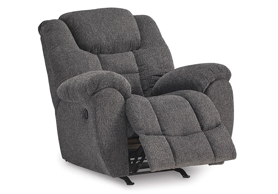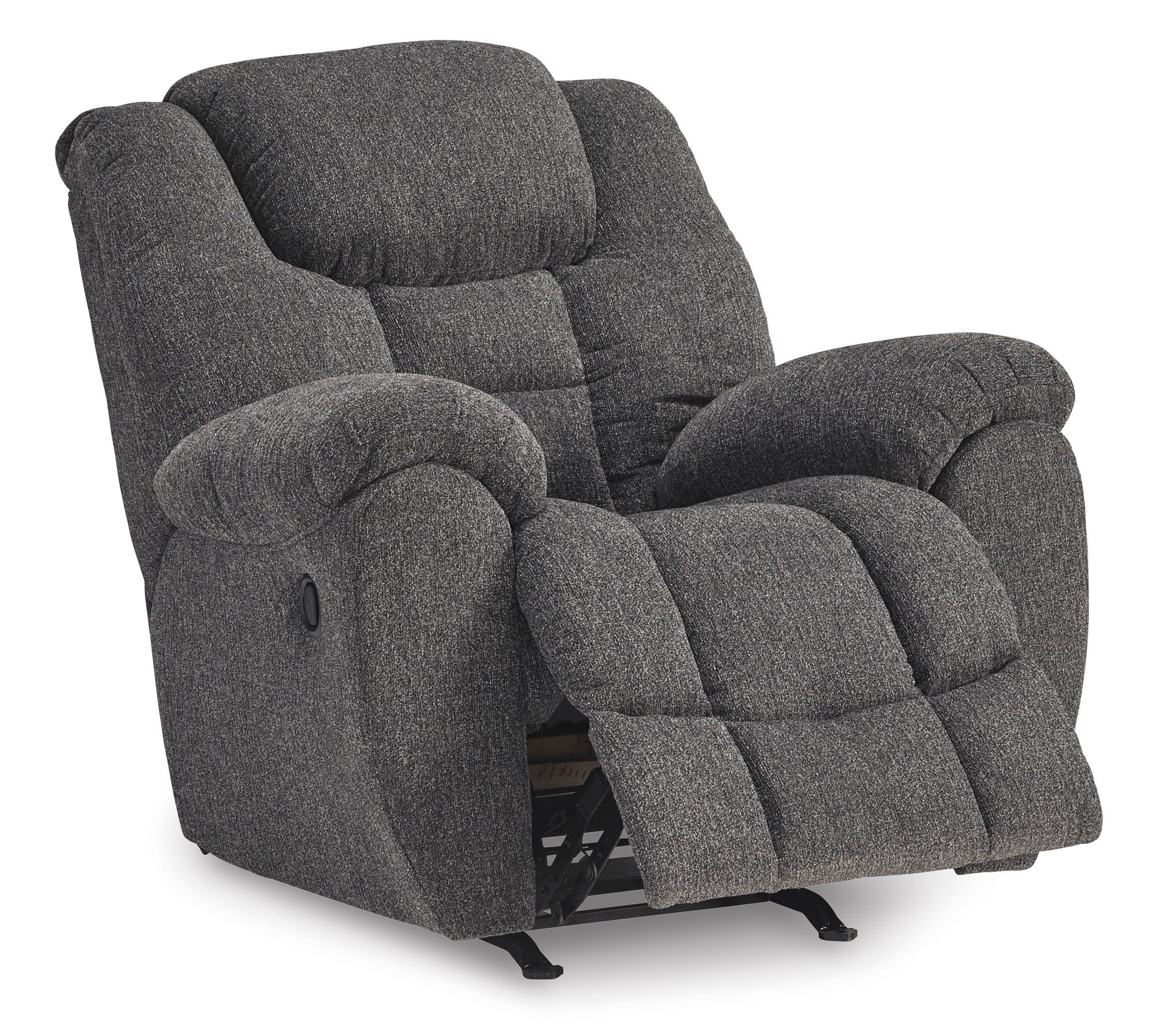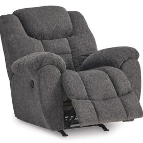 Pull tab reclining motion. Corner-blocked frame with metal reinforced seat. Attached back and seat cushions. High-quality foam cushions wrapped in poly fiber. Polyester upholstery. Next-Gen Nuvella is a performance fabric that is soft, easy to clean, stain-resistant and durable.