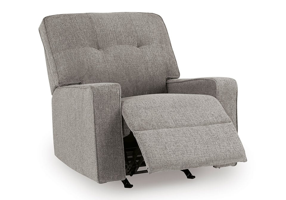 One-pull reclining motion. Corner-blocked frame with metal reinforced seat. Attached cushions. High-quality foam cushions wrapped in poly fiber. Polyester upholstery. Gentle rocking motion.