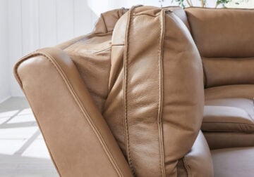 Live and lounge luxuriously. This power reclining sofa brings an ultra-stylish flair to your home’s central hub. Its seating area is wrapped in top-grain leather in a rich caramel coloration, giving you a trend-right look made all the better with high-quality materials. And with the simple push of a button, you can recline or adjust the headrests to find your ideal comfort position.