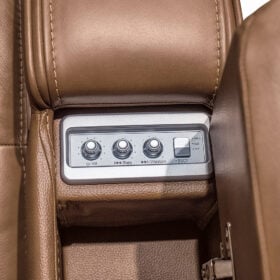 - Armrests with flip-top storage; hidden Thunder control panel with adjustable volume, bass and vibration knobs