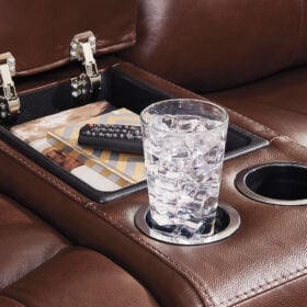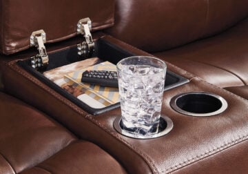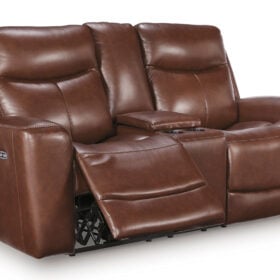 Prepare to be moved. This power reclining loveseat with console combines sleek modern design with all the soothing features you’ve been dreaming of. Wrapped in mahogany leather and faux leather upholstery for affordable luxury, this highly contemporary piece with cozy scoop seating suits your relaxed vibe. Infinite reclining and headrest positions are yours at the touch of a button. It’s the perfect choice for anyone who wants their comfort with a side of style.