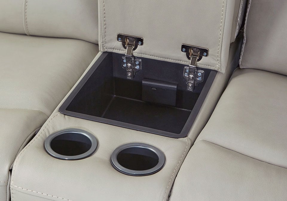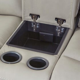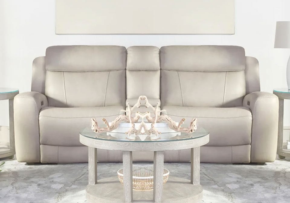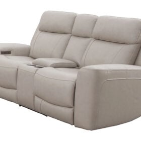 Upholstered in smooth, in Genuine leather. Power recline & power headrests (P2 functionality). Deep, supportive seating with plush armrests and back cushions. Built-in center console with cup holders and hidden storage. Sleek modern design with a neutral tone that suits any décor. Ideal for media rooms, living rooms, and open-concept spaces. Due to its natural origin, real leather can show individual characteristics such as healed scars, growth marks, grain variation and shade variation. Natural variations make each hide unique and do not detract from the wearing qualities of leather.