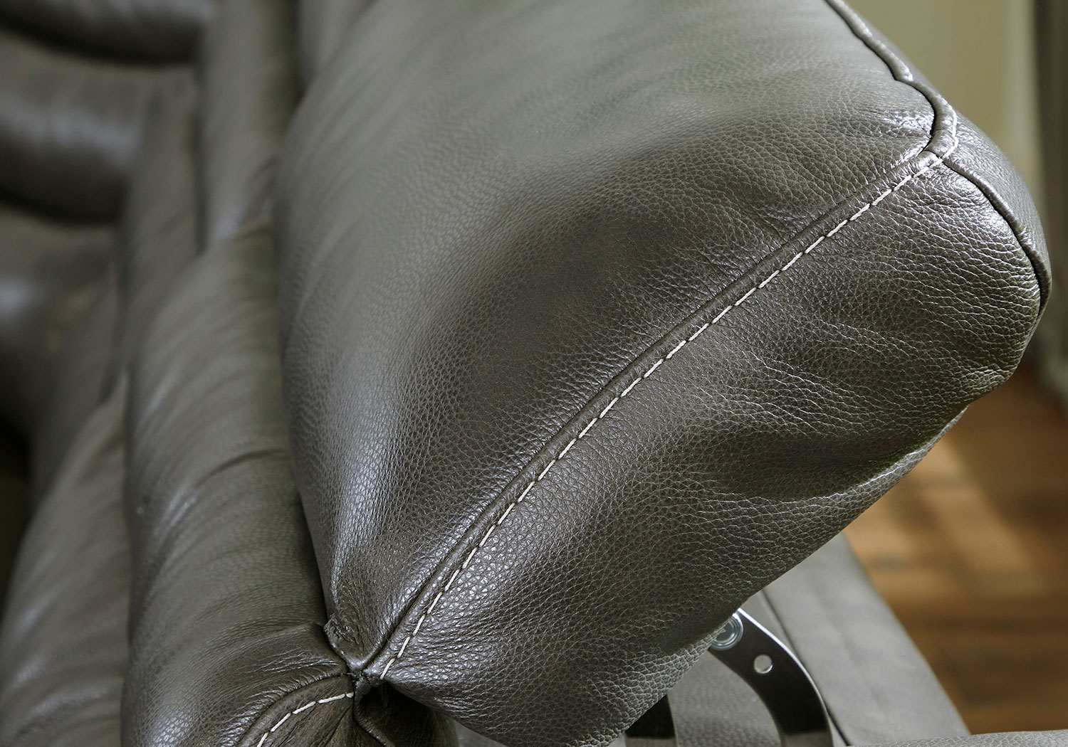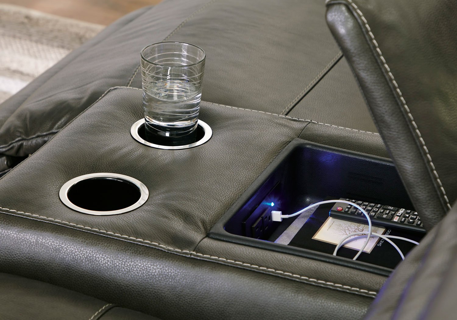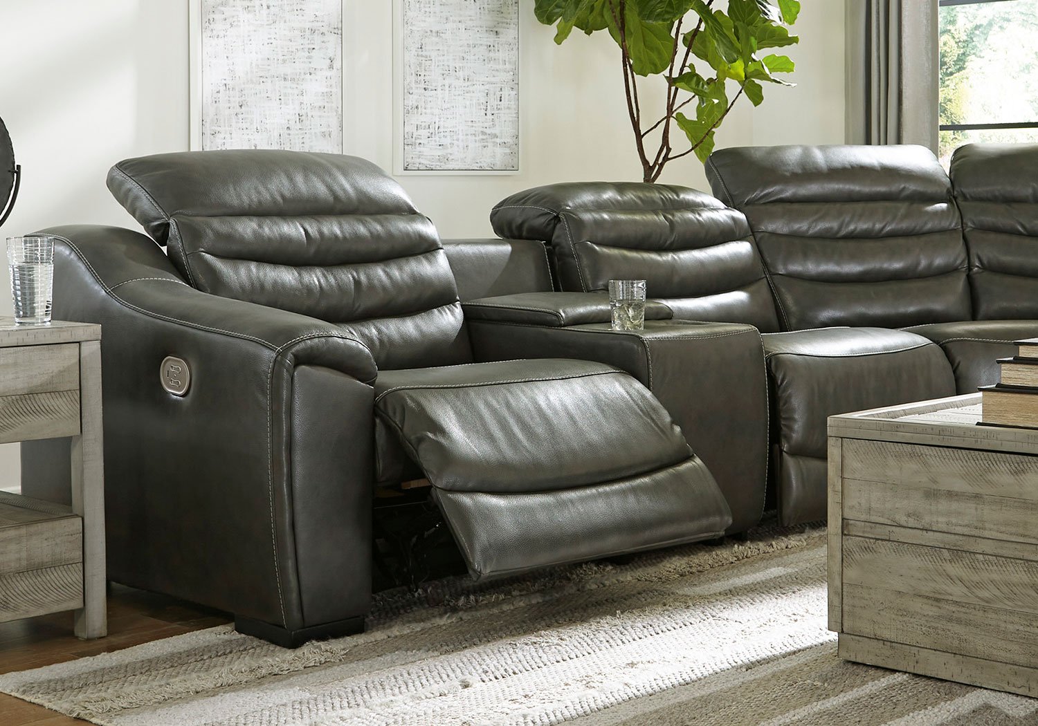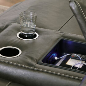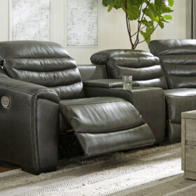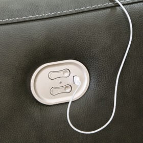 For those seeking to curate a living room retreat that offers superior comfort and a contemporary aesthetic, this sleekly designed power reclining sectional will become your favorite source of at-home serenity. Rest on expertly matched leather and faux leather upholstery, and use the one-touch power control to recline and adjust the headrests with ease. As you recharge after a long day, your devices can too with USB charging. This sectional is visually enticing in a luxe dark gray, with slope track arms and stitched detailing on the back to enhance its modern appeal.