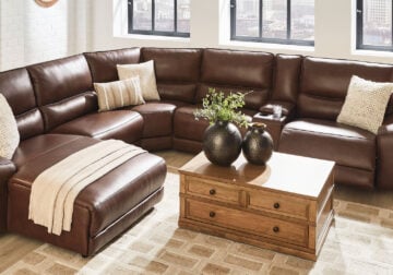 Live and lounge luxuriously. This power reclining sectional with chaise brings an ultra-stylish flair to your home’s central hub. Its seating area is wrapped in top grain leather in a sleek neutral color, giving you a trend-right look made all the better with high-quality materials. And with the simple push of a button, you can adjust the headrests or recline to find your ideal comfort position.