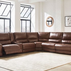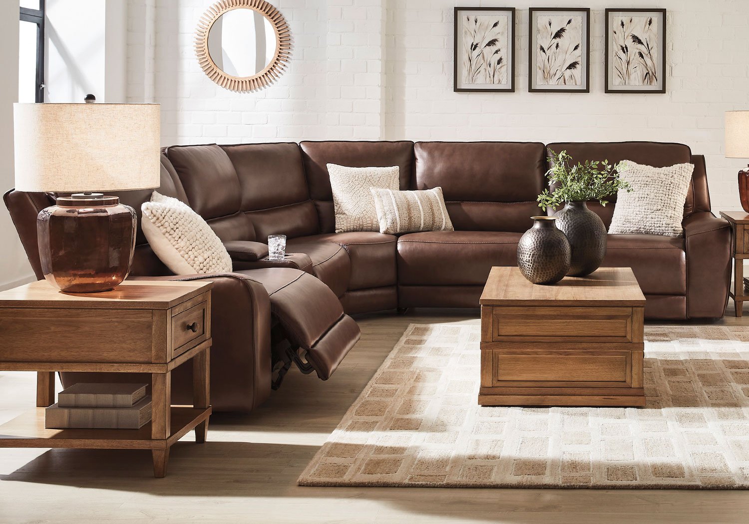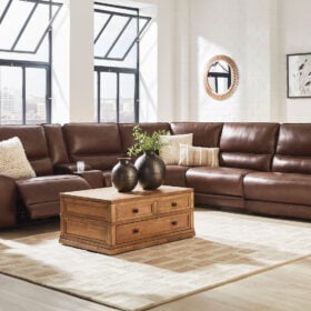 Live and lounge luxuriously. This power reclining sectional with storage console brings an ultra-stylish flair to your home’s central hub. Its seating area is wrapped in top grain leather in a sleek neutral color, giving you a trend-right look made all the better with high-quality materials. And with the simple push of a button, you can adjust the headrests or recline to find your ideal comfort position.