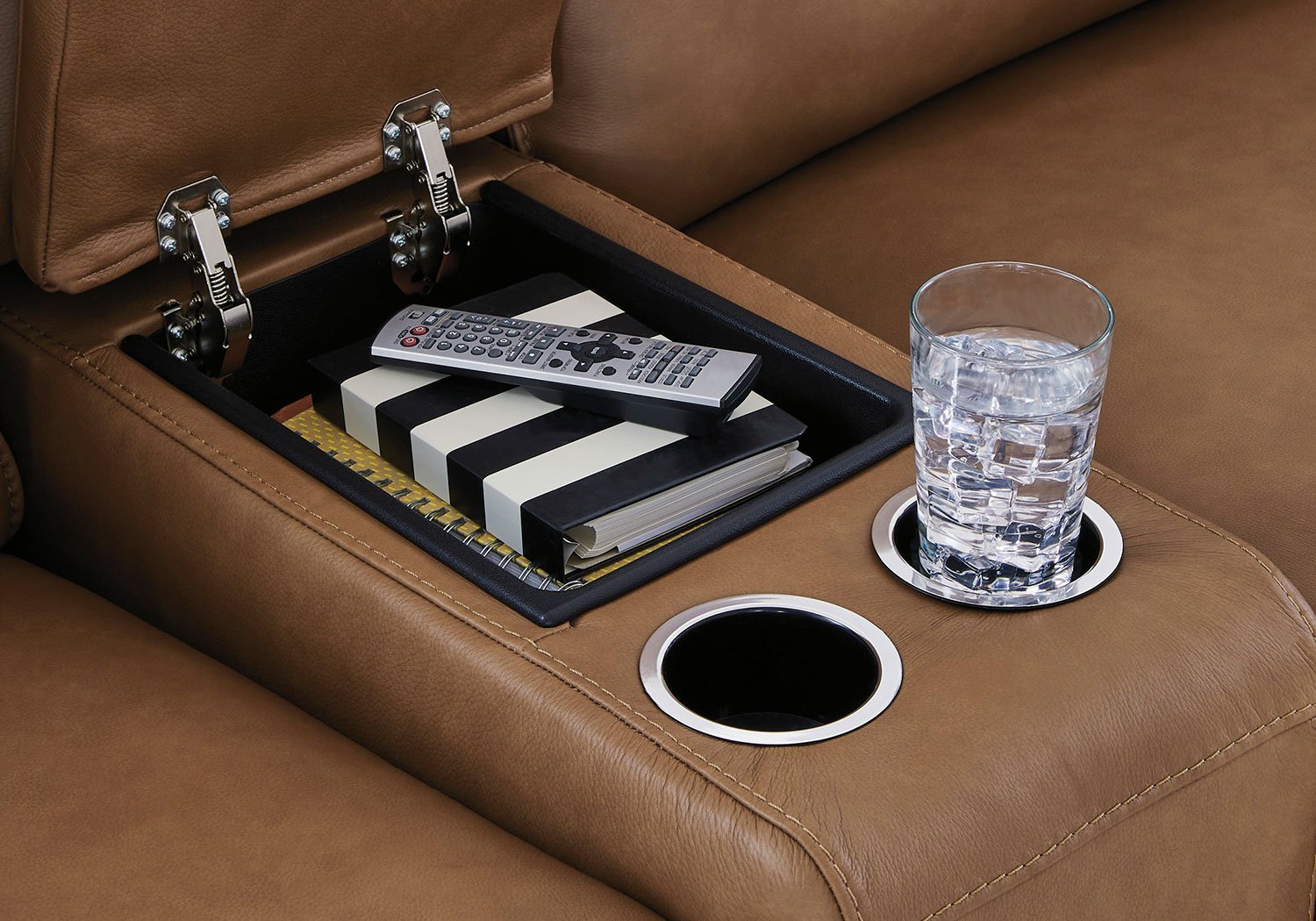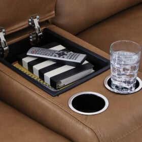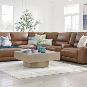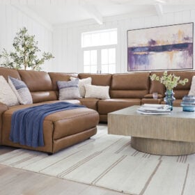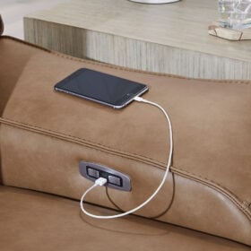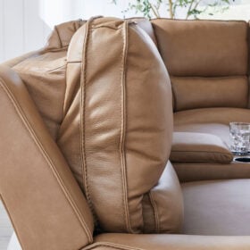 Live and lounge luxuriously. This power reclining sectional with chaise brings an ultra-stylish flair to your home’s central hub. Its seating area is wrapped in top grain leather in a rich caramel color, giving you a trend-right look made all the better with high-quality materials. And with the simple push of a button, you can adjust the headrests or recline to find your ideal comfort position.