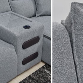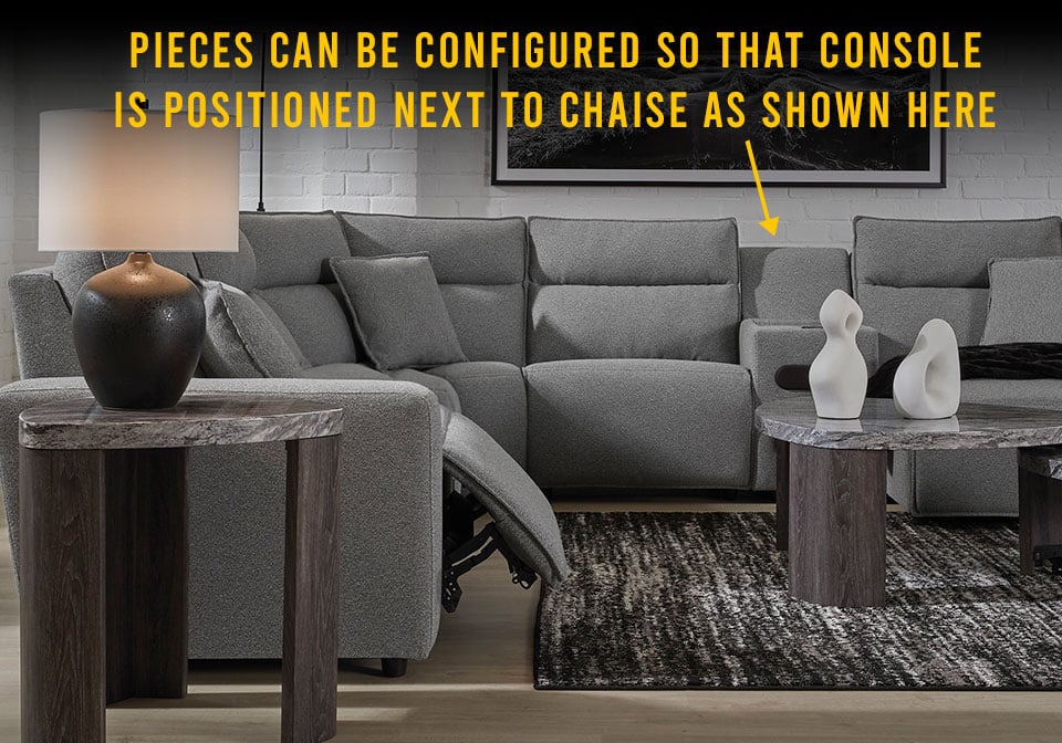 Includes 6 modular pieces: right-arm facing power push back Chaise, Audio console, corner wedge, armless chair, armless power recliner, and left-arm facing power recliner. Corner-blocked frame. Loose reversible seat and back cushions. High-quality foam cushions wrapped in poly fiber. Throw pillows included; soft polyfill. Polyester upholstery. Next-Gen Nuvellaâ„¢ is a family-friendly fabric that is soft, easy to clean, stain-resistant and durable; easy-to-remove zippered covers for machine washing. Non-skid legs. Console with removable plexiglass top; pull-out drawer for storage; built-in audio sound system with wireless connectivity; audio controls located on console; USB charging. Platform foundation system resists sagging 3x better than spring system after 20,000 testing cycles by providing more even support. Smooth platform foundation maintains tight, wrinkle-free look without dips or sags that can occur over time with sinuous spring foundations.Â