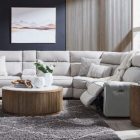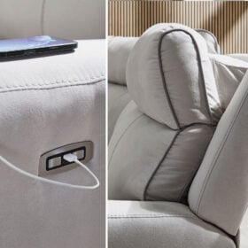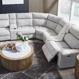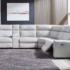 Smart, clean and ultra modern, this power reclining sectional is utterly in vogue. You’ll love its indulgent cushions and contemporary bustle back styling. The sumptuous fabric, accentuated with contrasting welting, easily blends with your decor. A convenient console with storage and cup holders keeps essentials handy. And with reclining at the press of a button, this modular sectional proves chic design and superb comfort go hand in hand.