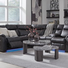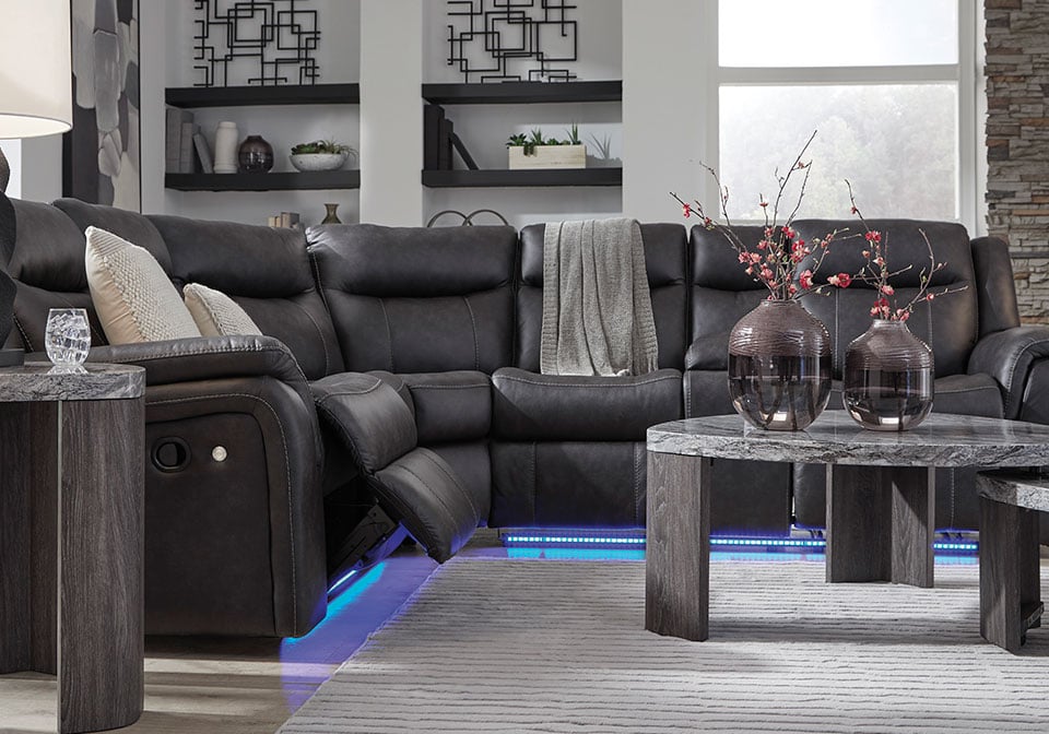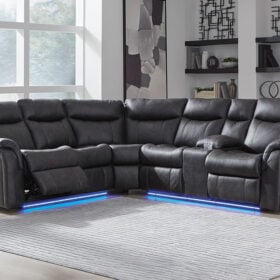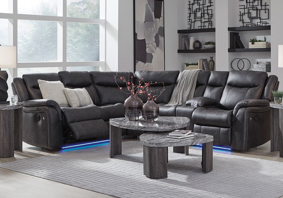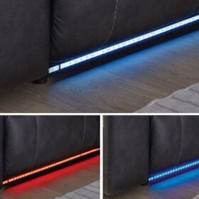 This reclining Series pairs the luxe look of faux leather with must-have functional features. LED lights on the underside put a modern twist on the simply chic design—choose from three colors to add ambiance to movie night or gaming with friends. And you can keep remotes, drinks and other entertainment essentials close with the handy console. Ready to relax? Easy pull tab reclining has you stretched out in no time.