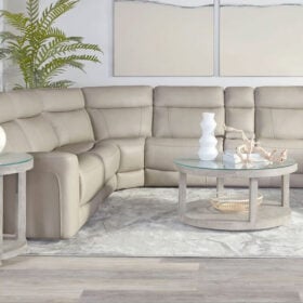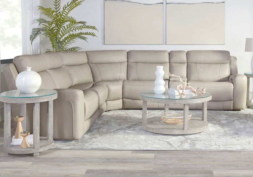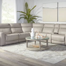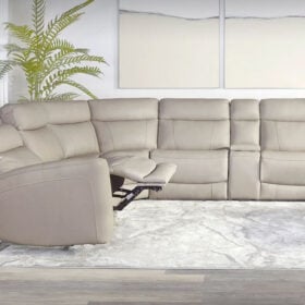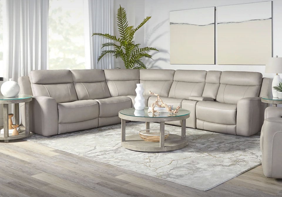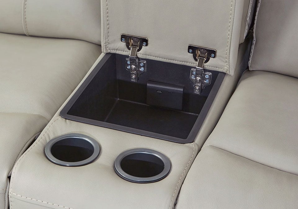 Upholstered in smooth, in Genuine leather. Power recline & power headrests (P2 functionality). Deep, supportive seating with plush armrests and back cushions. Built-in center console with cup holders and hidden storage. Sleek modern design with a neutral tone that suits any décor. Ideal for media rooms, living rooms, and open-concept spaces. Due to its natural origin, real leather can show individual characteristics such as healed scars, growth marks, grain variation and shade variation. Natural variations make each hide unique and do not detract from the wearing qualities of leather.