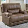 Live and lounge luxuriously. This power reclining sofa brings an ultra-stylish flair to your home’s central hub. Its seating area is wrapped in top-grain leather in a rich caramel coloration, giving you a trend-right look made all the better with high-quality materials. And with the simple push of a button, you can recline or adjust the headrests to find your ideal comfort position.