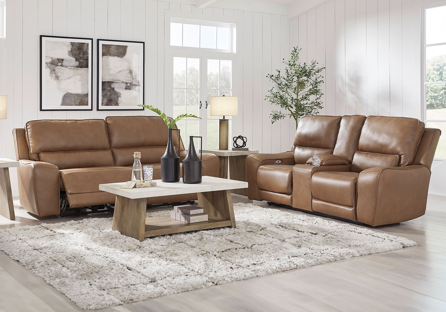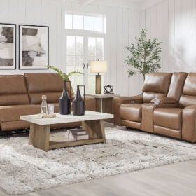 Live and lounge luxuriously. This power reclining sofa brings an ultra-stylish flair to your home’s central hub. Its seating area is wrapped in top-grain leather in a rich caramel coloration, giving you a trend-right look made all the better with high-quality materials. And with the simple push of a button, you can recline or adjust the headrests to find your ideal comfort position.