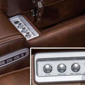 - Armrests with flip-top storage; hidden Thunder control panel with adjustable volume, bass and vibration knobs