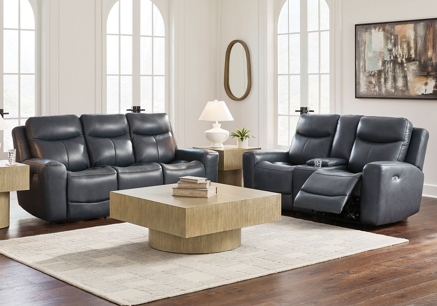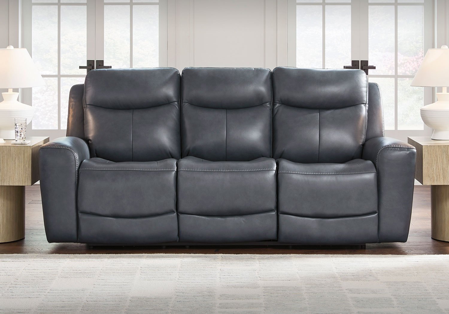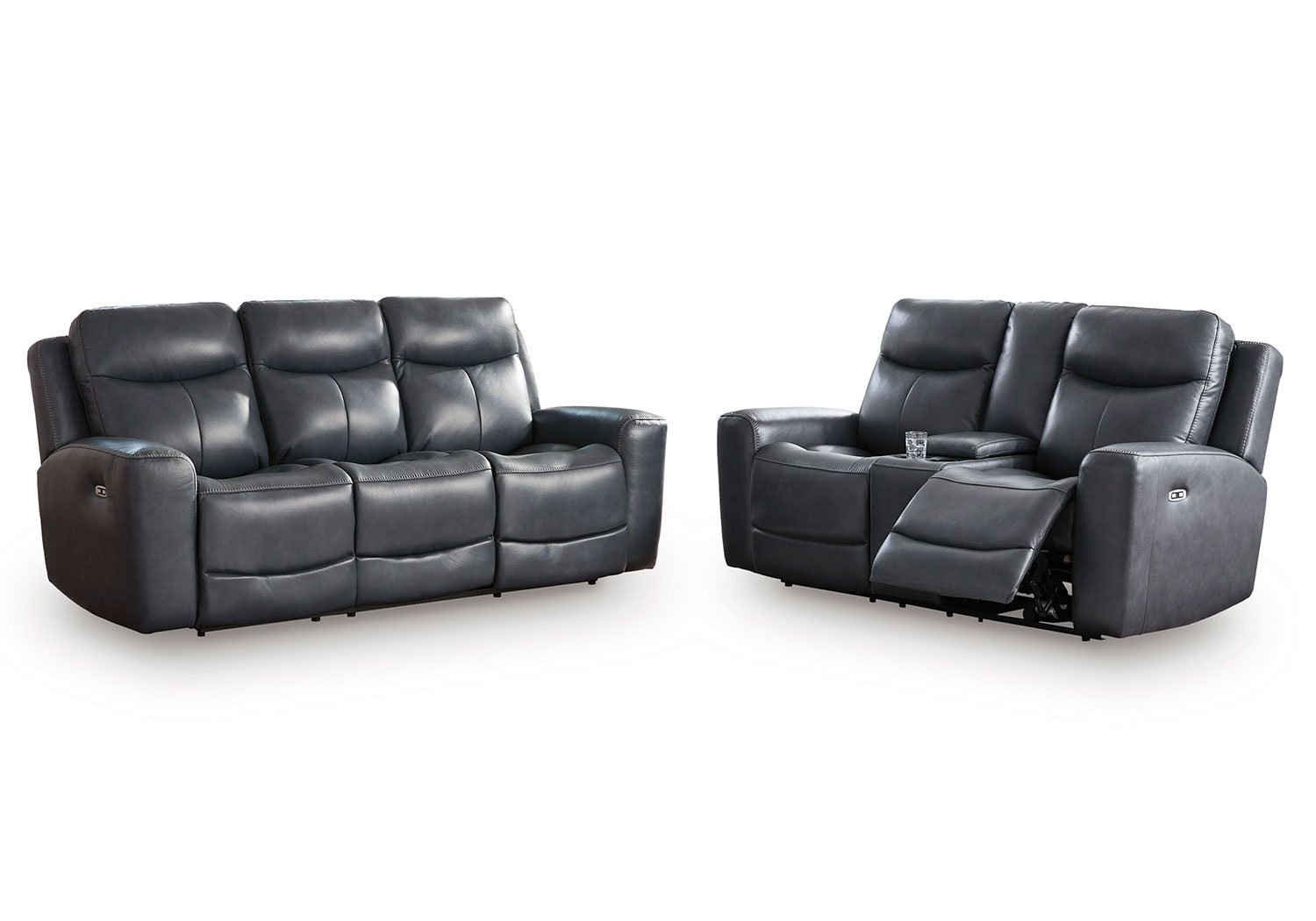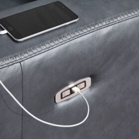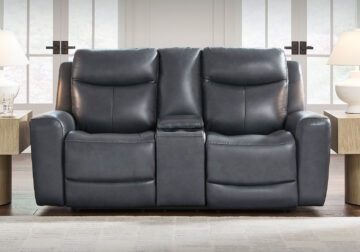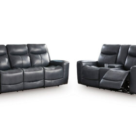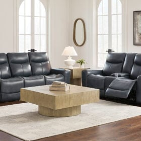 Prepare to be moved. This power reclining sofa set combines sleek modern design with all the soothing features you’ve been dreaming of. Wrapped in blue-hued leather and faux leather for affordable luxury, this highly contemporary set with cozy scoop seating suits your relaxed vibe. Infinite reclining and headrest positions are yours at the touch of a button. It’s the perfect choice for anyone who wants their comfort with a side of style.