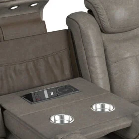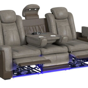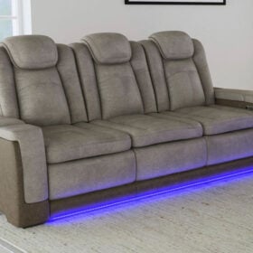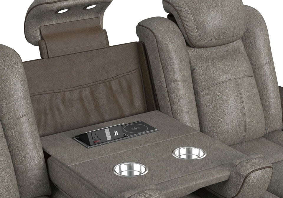 Luxurious, dual-toned faux leather upholstery. Power reclining functionality for smooth comfort. Ample foam-cushioned seating for superior support. Hidden armrest storage for easy organization. Integrated LED lighting for modern ambiance. Built-in power ports and wireless chargers. Sofa with Drop Down Table. Loveseat with Storage Console. Sleek, contemporary design with premium craftsmanship.
