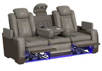 Luxurious, dual-toned faux leather upholstery. Power reclining functionality for smooth comfort. Ample foam-cushioned seating for superior support. Hidden armrest storage for easy organization. Integrated LED lighting for modern ambiance. Built-in power ports and wireless chargers. Sofa with Drop Down Table. Loveseat with Storage Console. Sleek, contemporary design with premium craftsmanship.