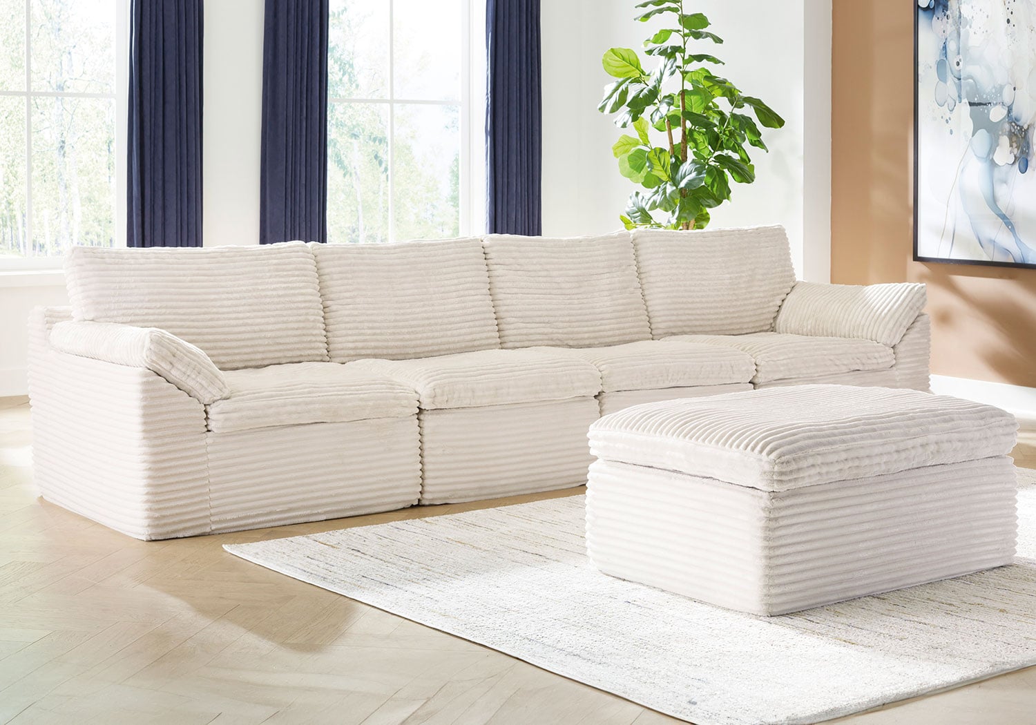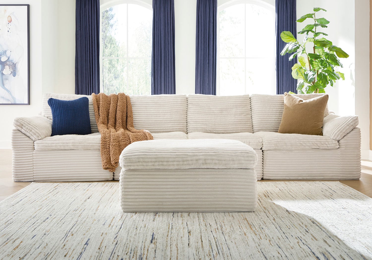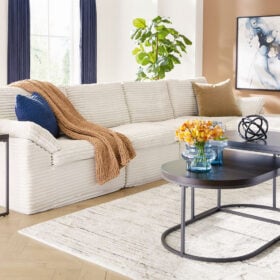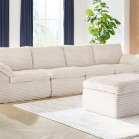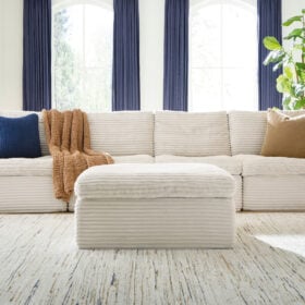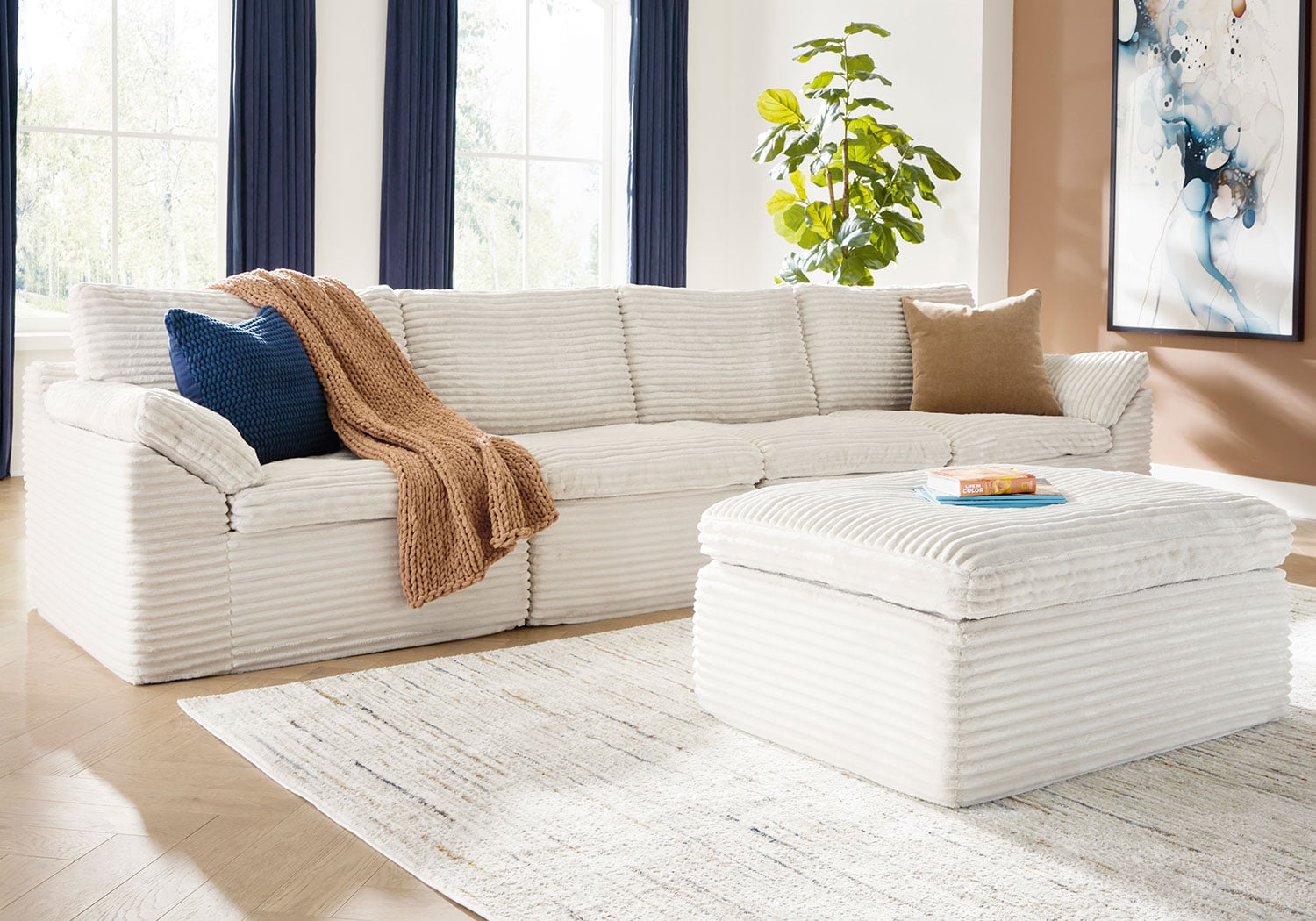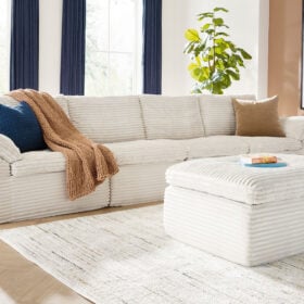 Make no bones about it. This Modular Series makes furnishing your home easier than ever thanks to its effortless “unpack, pop up and fluff” design. Plush cushions with memory foam and feather-fiber wrapping provide luxurious softness. Ottoman can also be placed as a Chaise. Sumptuous corduroy fabric impresses but doesn’t overwhelm, creating a cozy and inviting approach to instant relaxation.