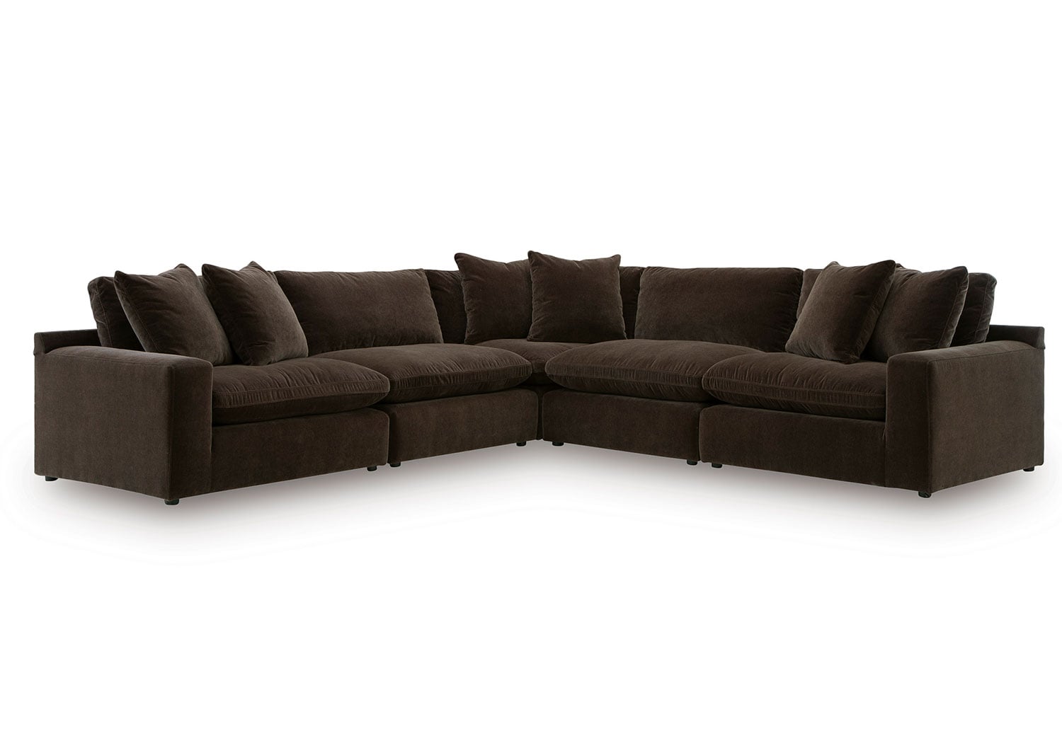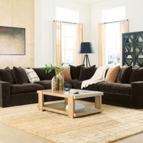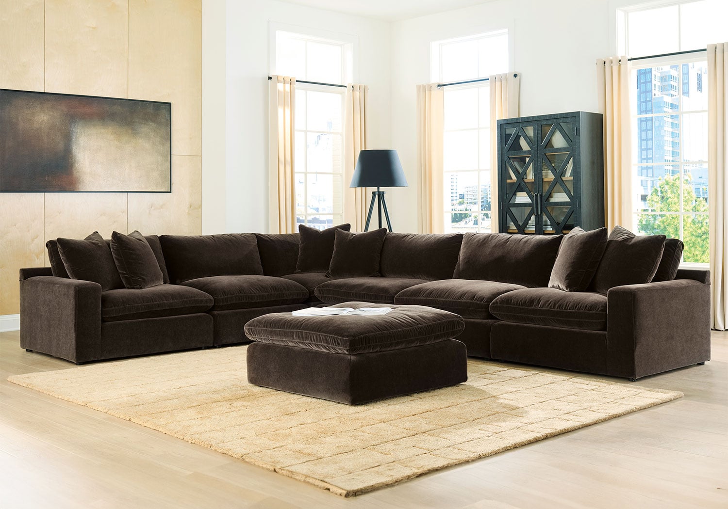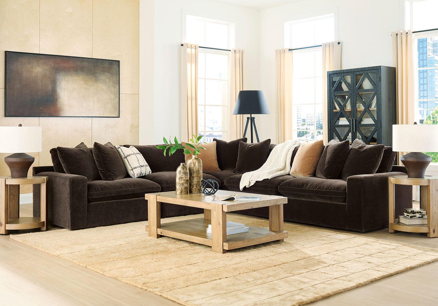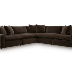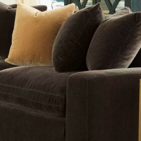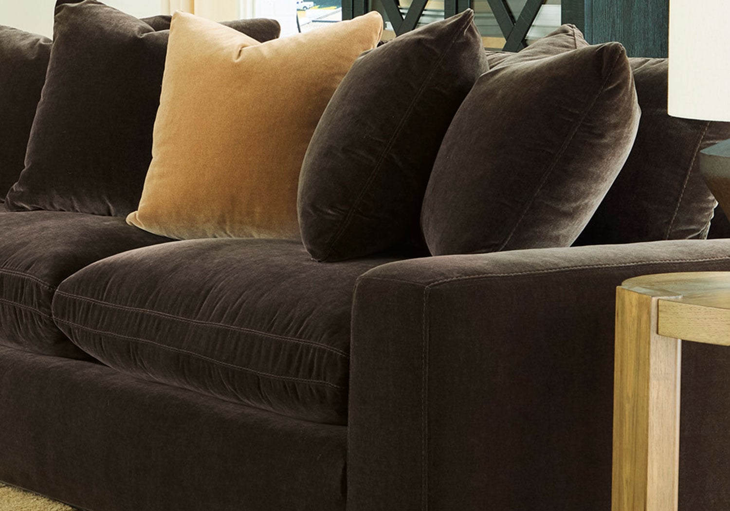Modular pieces can float anywhere in a room setting; sides are finished (with no connectors). Reinforced frame provides added stability. Reversible seat and back cushions. High-density foam back cushions wrapped in feather-fiber blend jacket. Multilayer seat cushions feature memory foam and high-quality foam surrounded by a soft feather-fiber blend for elevated comfort. . Pillows with feather-fiber blend. Polyester velvet upholstery. Non-skid legs. Platform foundation system resists sagging 3x better than spring system after 20,000 testing cycles by providing more even support. Smooth platform foundation maintains tight, wrinkle-free look without dips or sags that can occur over time with sinuous spring foundations.
