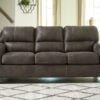 If you love the cool look of leather but long for the warm feel of fabric, you can take comfort in this queen sofa sleeper. Wrapped in fabulous faux leather with a weathered hue and hint of pebbly texture to resemble the real deal, this decidedly modern sofa proves less is more. Including angled side profiling and track armrests wrapped with a layer of pillowy softness for that little something extra. Prominent jumbo stitching and clean-lined divided back styling lend fashion-forward flair. The queen memory foam mattress comfortably accommodates overnight guests.