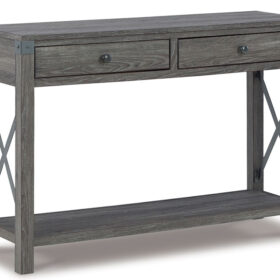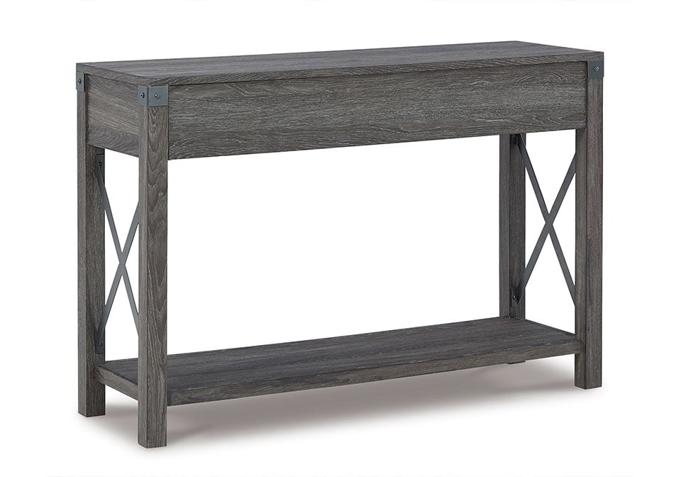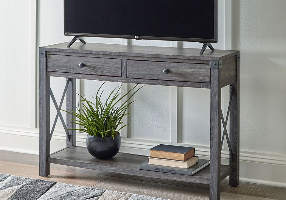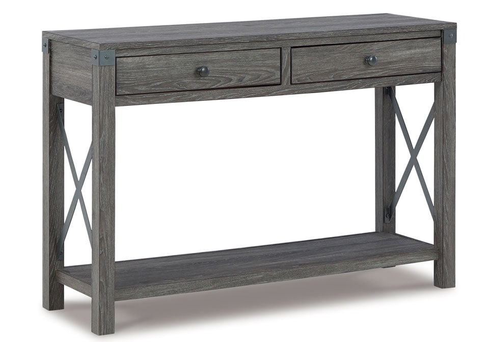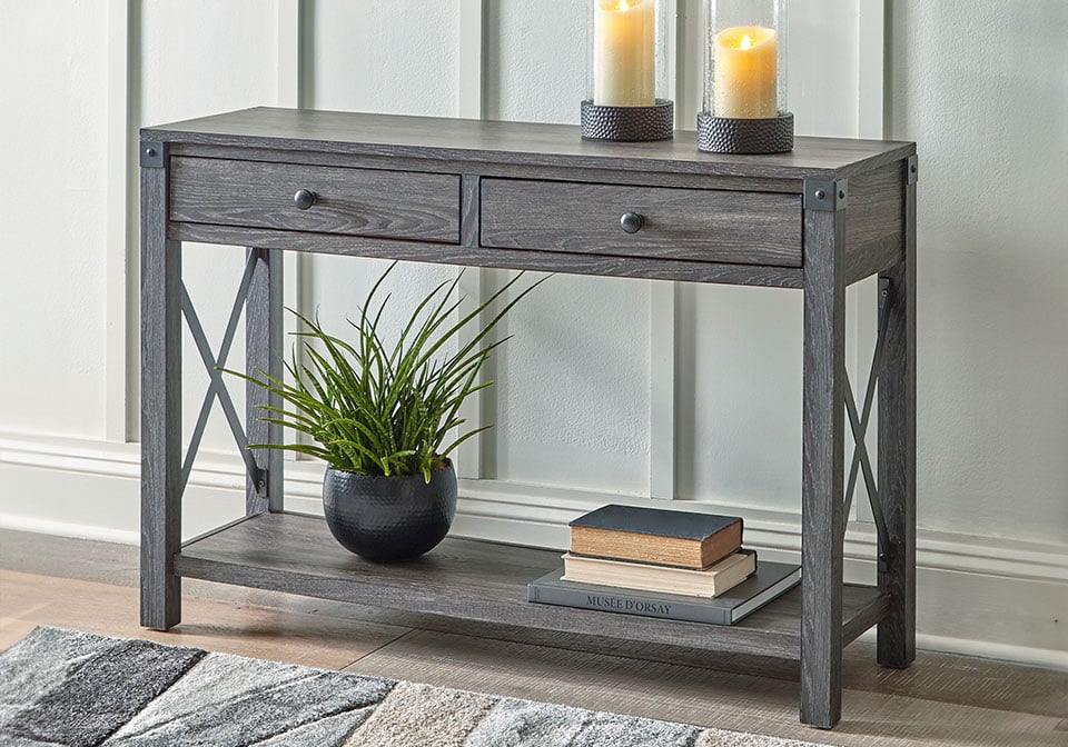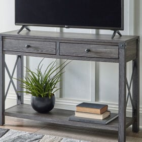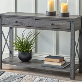 Open the door to modern farmhouse style with this console table. The beautiful woodgrain look and classic crossbuck metal accents are a cool touch, while the lower shelf provides surface space for fashionable home accessories. A pair of smooth-gliding drawers is the answer to the daily, where-are-my-keys question.