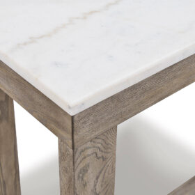 This sofa table is simple in design but big on style. Finished with a trend-right grayish brown wood tone, its bold, blocky profile and natural marble top are timeless, classic choices. This table is ideal for pairing with an ottoman to pull extra seating into the room, or for remaining clean and sleek on its own.