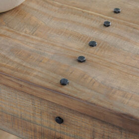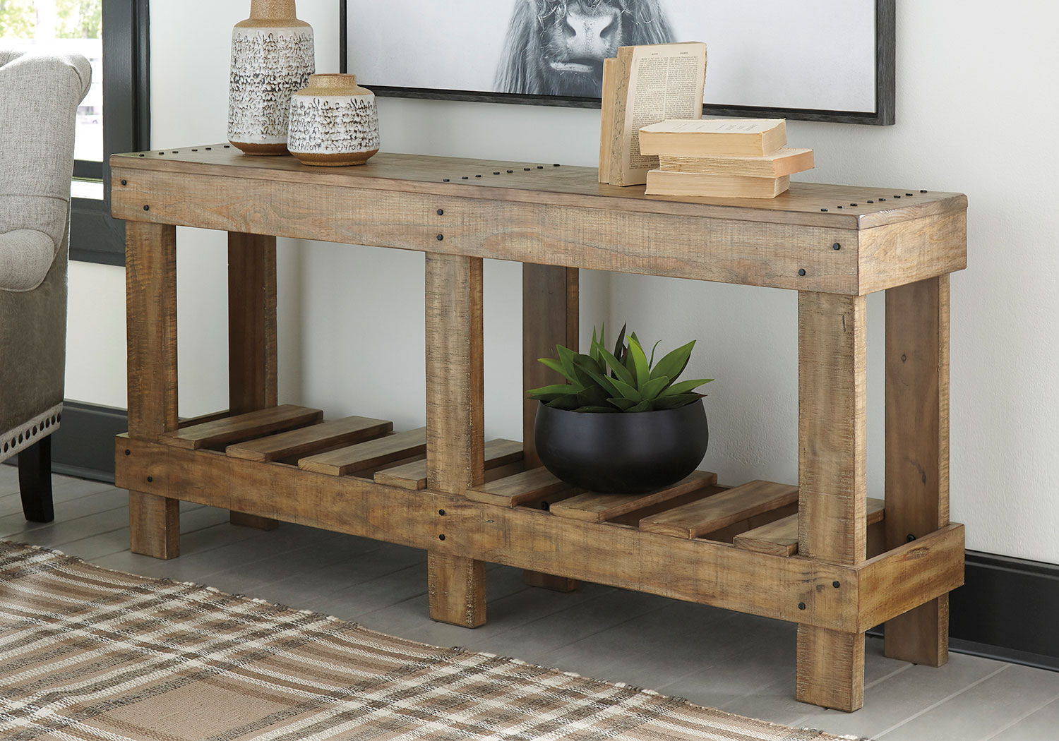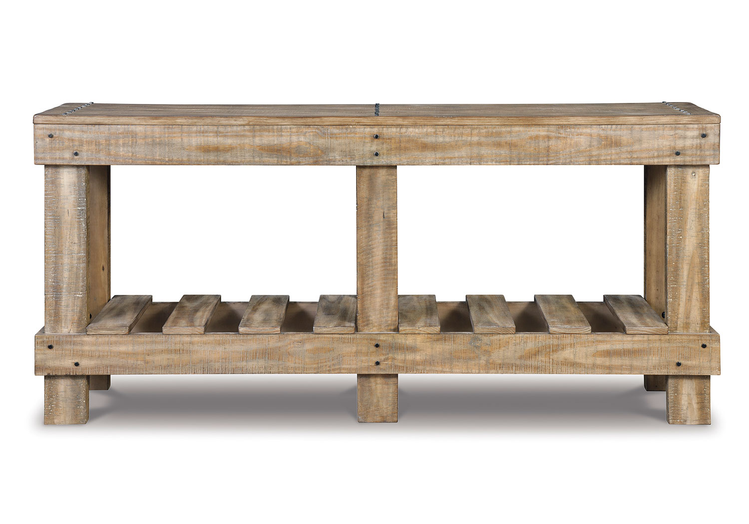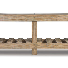 As this console table proves, sometimes less is more. Dramatically transform your living space with the warm and rustic appeal of solid wood construction and open-slat shelving. Washed in a light brown finish, this sofa table sets a new standard for down-to-earth refinement.